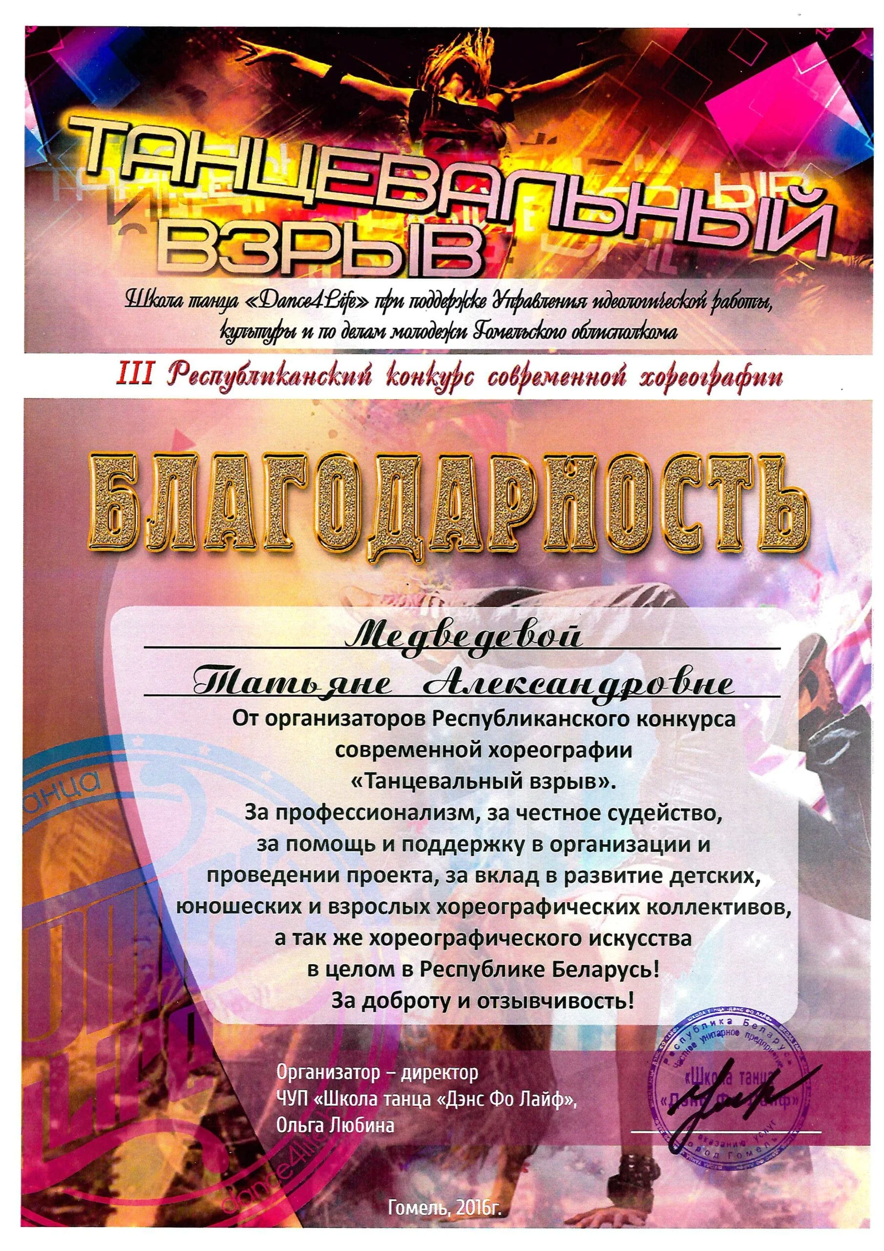 "Лучшая студия в Гомеле, Татьяна Александровна самый лучший преподаватель: креативная, терпеливая, талантливый хореограф, профессионал своего дела. Дети её любят и мы, группа взрослых, просто обожаем. Большой светлый красивый зал и неповторимая творческая атмосфера, основанная на взаимном уважении и любви к танцам".